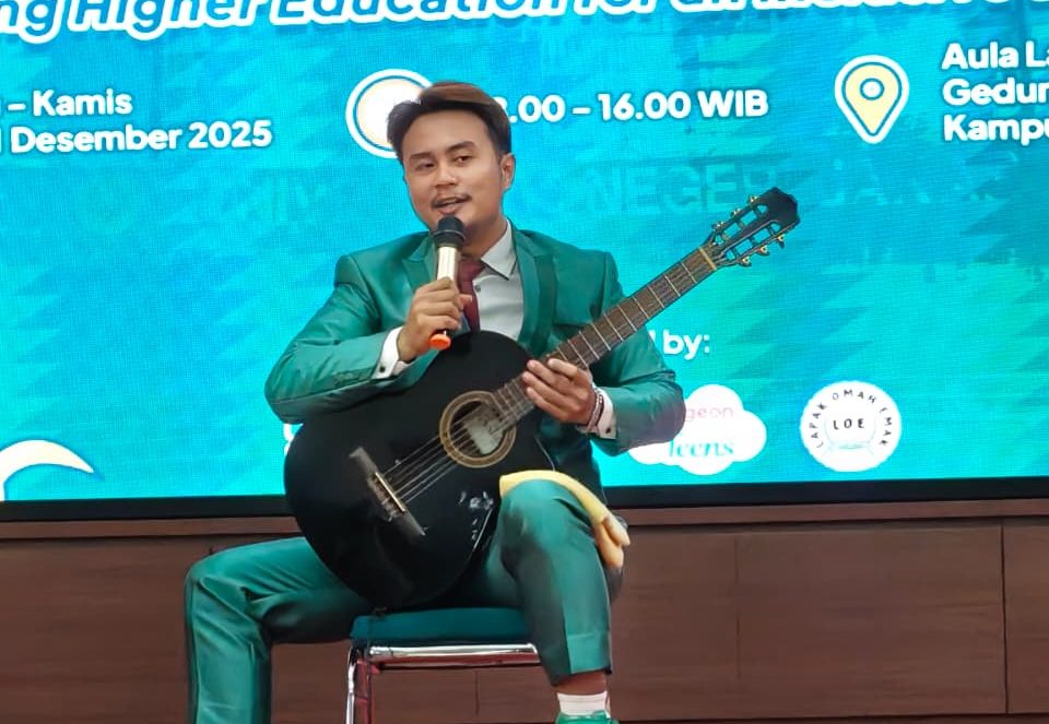 Jakarta, Humas UNJ – Suasana Pameran Pendidikan Universitas Negeri Jakarta (UNJ) 2025 pada Kamis, 11 Desember 2025, semakin semarak dengan penampilan Nyong Alga, musisi gitar klasik sekaligus alumni UNJ. Alga kembali ke kampus bukan sebagai mahasiswa, melainkan sebagai musisi profesional yang menghibur pengunjung melalui petikan gitarnya.