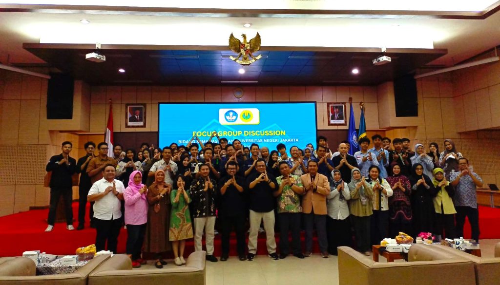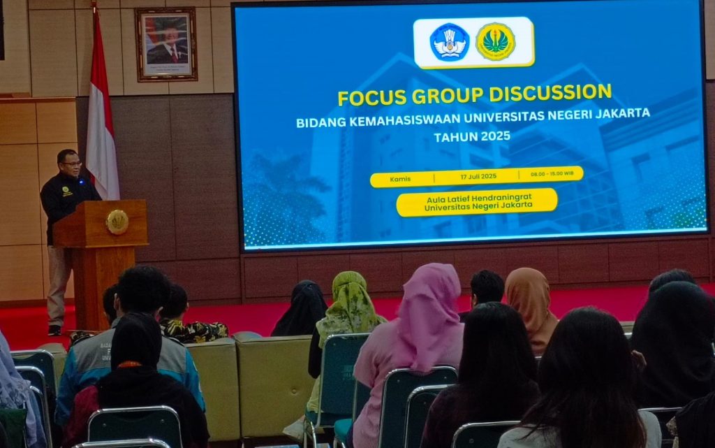 Jakarta, Humas UNJ – Direktorat Kemahasiswaan dan Alumni Universitas Negeri Jakarta (UNJ) menyelenggarakan Focus Group Discussion (FGD) Bidang Kemahasiswaan dengan tema utama “Kurikulum Kemahasiswaan, PKKMB, dan Program Kemdiktisaintek Berdampak,” khususnya yang berfokus pada kegiatan pengabdian masyarakat oleh Badan Eksekutif Mahasiswa (BEM). Kegiatan FGD ini dilaksanakan pada Kamis, 17 Juli 2025 di Aula Latif Hendraningrat, Kampus A UNJ. Kegiatan ini diikuti oleh perwakilan OPMAWA dan ORMAWA dari tingkat universitas hingga program studi. Selain itu, acara ini juga dihadiri oleh para Wakil Dekan Bidang Akademik, Kemahasiswaan, dan Alumni serta Koordinator Layanan dari seluruh fakultas di lingkungan UNJ.
