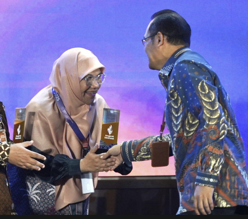Foto: Helvy Tiana Rosa, dosen Fakultas Bahasa dan Seni (FBS) UNJ, saat menerima piagam penghargaan Anugerah DIKTISAINTEK 2025 (kiri)