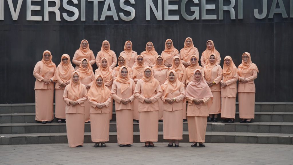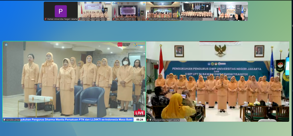 Jakarta, Humas UNJ — Dharma Wanita Persatuan Universitas Negeri Jakarta (DWP UNJ) resmi dikukuhkan oleh DWP Kementerian Pendidikan Tinggi, Sains, dan Teknologi (Kemdiktisaintek) untuk masa bakti 2024–2029. Pengukuhan tersebut berdasarkan Surat Keputusan Nomor 076 Tahun 2025 dan dilakukan serentak secara daring melalui Zoom, pada Rabu (20/8). Sebanyak 95 DWP dari Perguruan Tinggi Negeri (PTN) dan LLDIKTI se-Indonesia turut dikukuhkan dalam kesempatan ini.