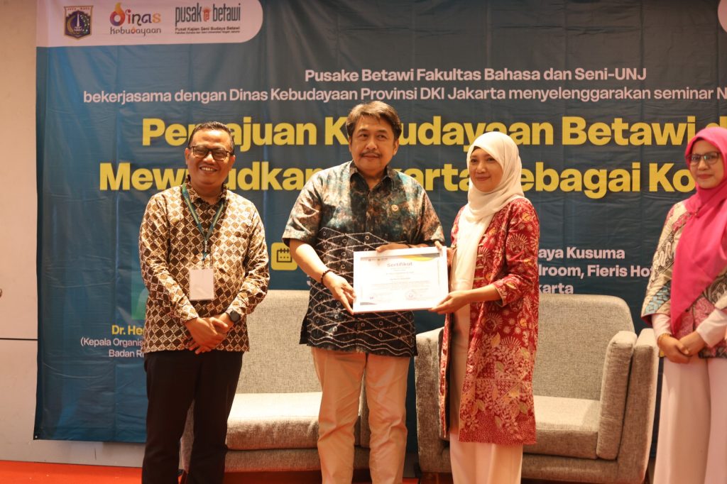 Jakarta, Humas UNJ— Pusake Betawi Fakultas Bahasa dan Seni Universitas Negeri Jakarta (FBS UNJ) bekerja sama dengan Dinas Kebudayaan Provinsi DKI Jakarta menyelenggarakan Seminar Nasional bertema “Pemajuan Kebudayaan Betawi dalam Mewujudkan Jakarta sebagai Kota Global” pada Rabu, 3 Desember 2025, di Fieris Hotel, Rawamangun, Jakarta Timur.
