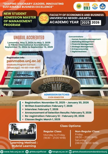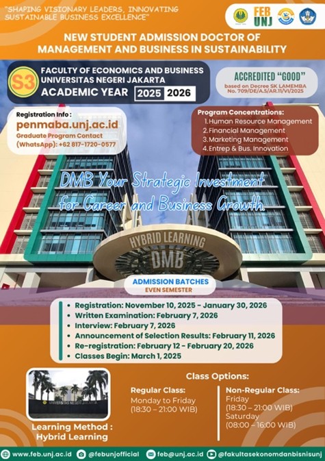 Jakarta, Humas UNJ — Fakultas Ekonomi dan Bisnis Universitas Negeri Jakarta (FEB UNJ) resmi membuka pendaftaran mahasiswa baru untuk Program Magister Manajemen (S2) dan Program Doktor Manajemen dan Bisnis Berkelanjutan (S3) Tahun Akademik 2025/2026. Pendaftaran gelombang semester genap dibuka mulai 10 November 2025 hingga 30 Januari 2026. Pembukaan pendaftaran ini sekaligus menegaskan konsistensi FEB UNJ dalam menghadirkan pendidikan pascasarjana yang berkualitas, relevan, dan berdaya saing internasional. Program Magister Manajemen FEB UNJ telah meraih Akreditasi “Unggul” melalui LAMEMBA dan Akreditasi Internasional FIBAA hingga tahun 2029, sementara Program Doktor Manajemen dan Bisnis Berkelanjutan memperoleh Akreditasi “Baik Sekali” dari LAMEMBA, menunjukkan mutu akademik yang kokoh dan terpercaya.