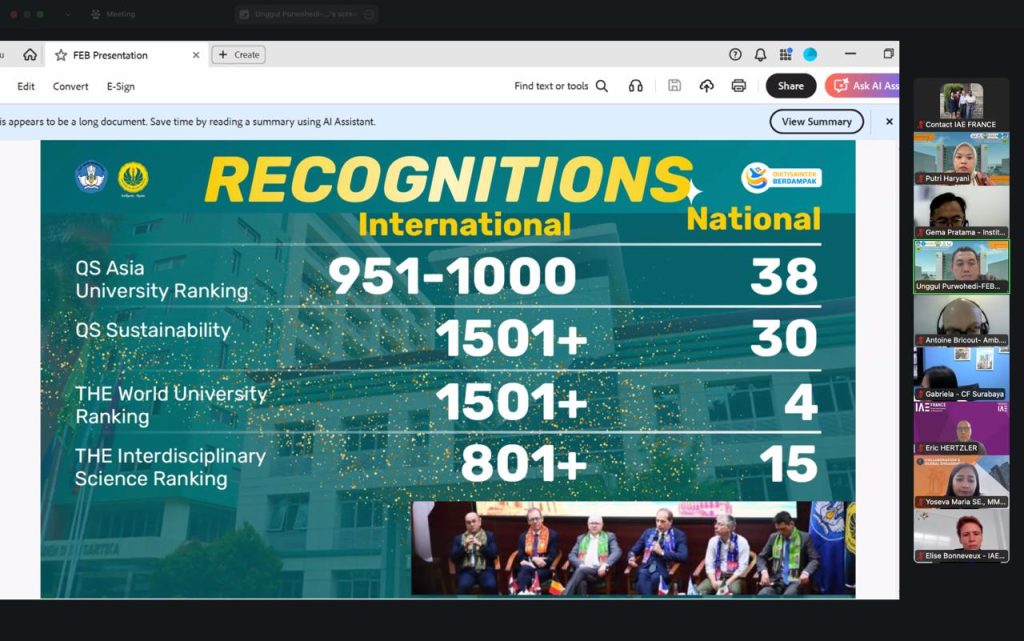 Jakarta, Humas UNJ — Fakultas Ekonomi dan Bisnis Universitas Negeri Jakarta (FEB UNJ) berpartisipasi dalam pertemuan oleh Divisi Kerja Sama Universitas Kedutaan Prancis atau Institut Français d’Indonésie (IFI) yang diselenggarakan secara daring pada 20 Januari 2026. Pertemuan ini dihadiri oleh Antoine Bricout, Attaché of Education and University Cooperation dari Kedutaan Besar Prancis di Indonesia, perwakilan dari IAE France (Institut d’Administration des Entreprises), serta perwakilan universitas dari Indonesia.
