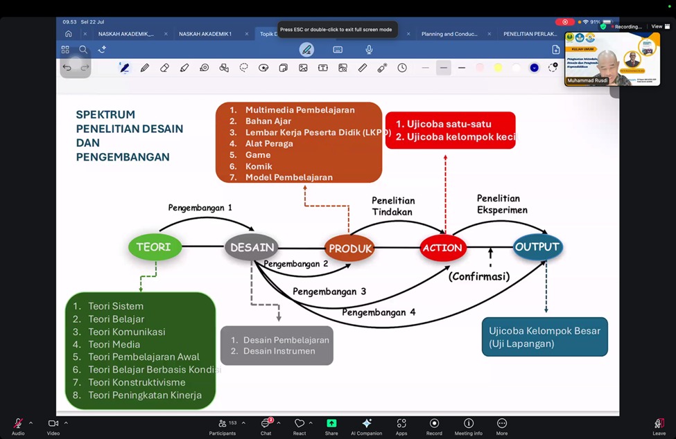 Prof. M. Rusdi dalam pemaparannya menyampaikan materi mendalam terkait pendekatan penelitian desain dan pengembangan, mencakup antara lain: