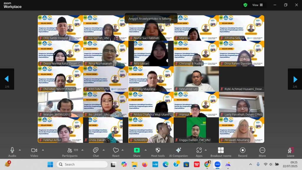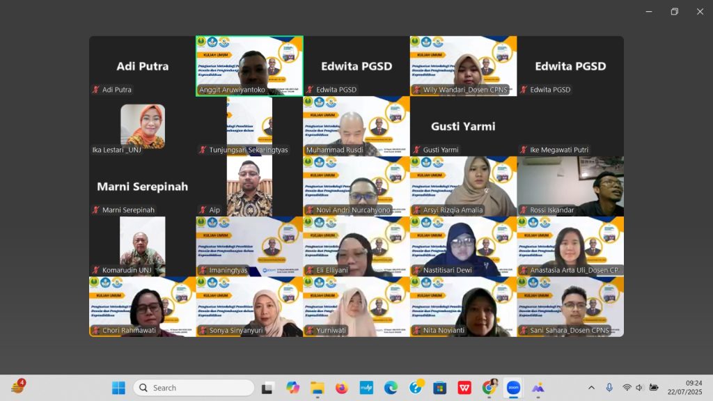 Jakarta, Humas UNJ — Fakultas Ilmu Pendidikan Universitas Negeri Jakarta (FIP UNJ) kembali menunjukkan komitmennya dalam memperkuat budaya riset dan inovasi di bidang pendidikan dengan menyelenggarakan kuliah umum bertajuk “Penguatan Metodologi Penelitian Desain dan Pengembangan dalam Kependidikan”, pada Selasa, 22 Juli 2025 secara daring melalui Zoom. Kegiatan ini merupakan hasil kolaborasi antara Program Studi Sarjana Pendidikan Guru Sekolah Dasar (PGSD), Program Magister, dan Program Doktor Pendidikan Dasar FIP UNJ. Kegiatan ini diikuti oleh 160 peserta yang terdiri dari dosen dan mahasiswa lintas jenjang, akademisi, dan praktisi pendidikan dari berbagai daerah.