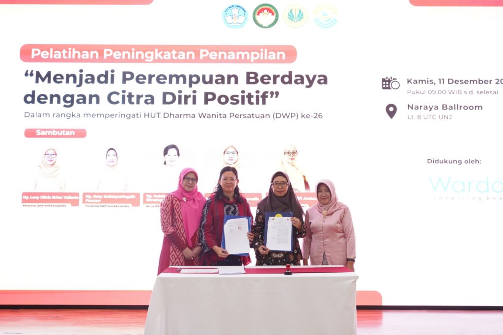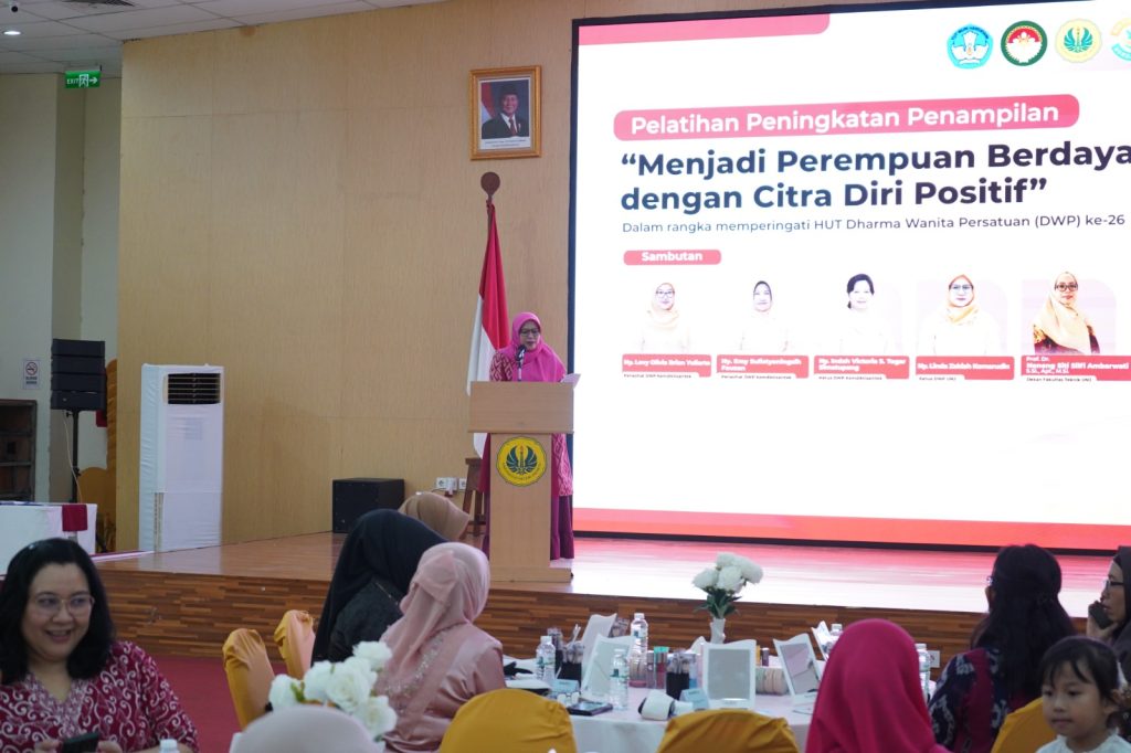 Jakarta, Humas UNJ – Fakultas Teknik Universitas Negeri Jakarta (FT UNJ) bekerja sama dengan Dharma Wanita Persatuan (DWP) Kementerian Pendidikan Tinggi, Sains, dan Teknologi menggelar pelatihan peningkatan penampilan bertema “Menjadi Perempuan Berdaya dengan Citra Diri Positif” dalam rangka memperingati Hari Ulang Tahun Dharma Wanita Persatuan (DWP) ke-26. Kegiatan ini berlangsung pada Kamis, 11 Desember 2025, di Hotel Naraya, Jakarta.