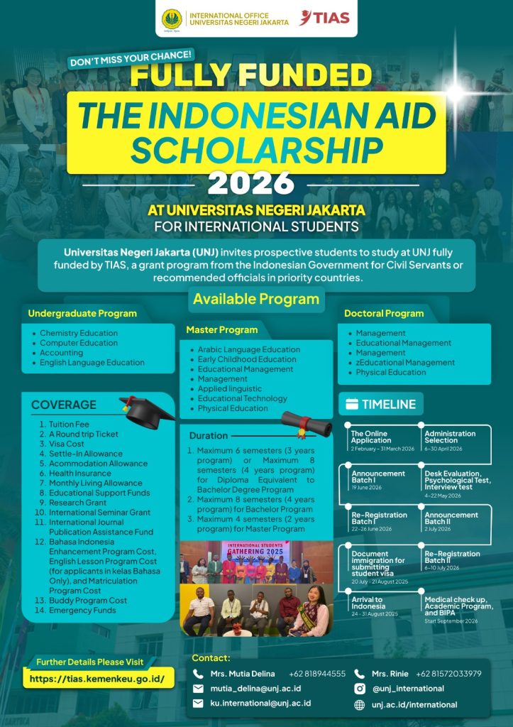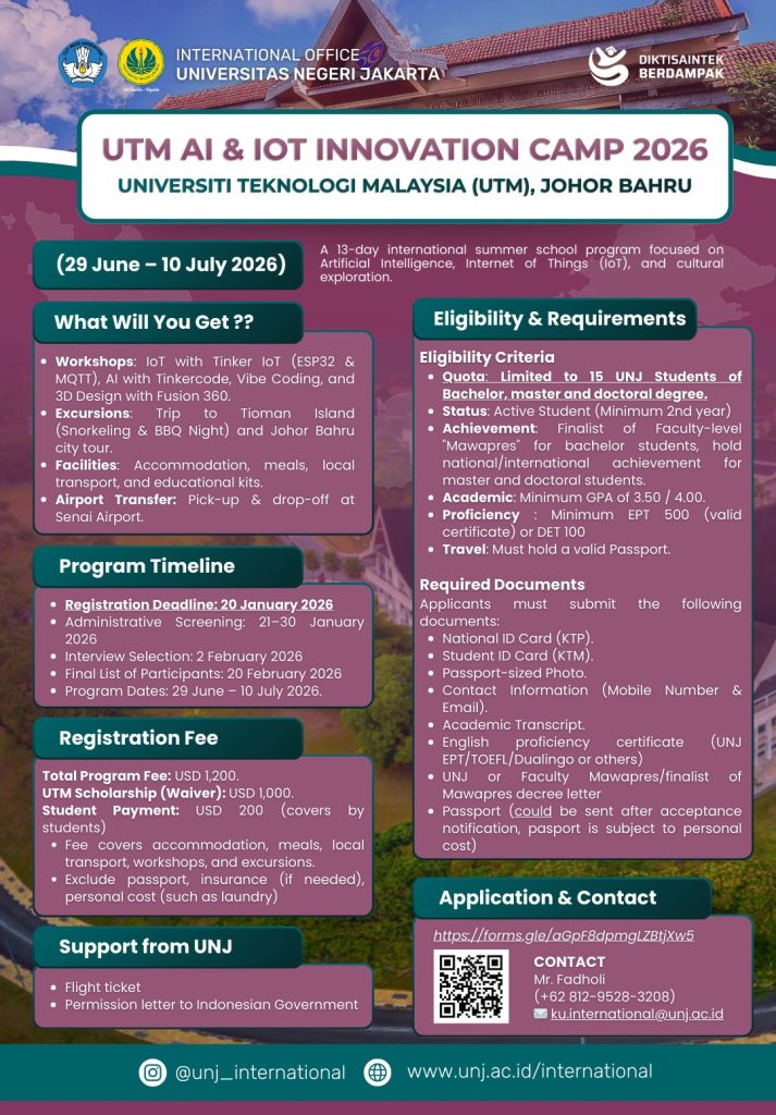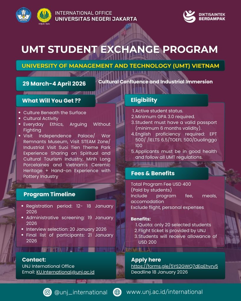 Expand your horizons with the International Internship Program Universitas Negeri Jakarta and gain valuable experience across cultures! Participate in three internship programs within the duration of 1-4 months. Gain experiences in your specific work field and interest in a professional level. Apply now and don’t miss your chance!