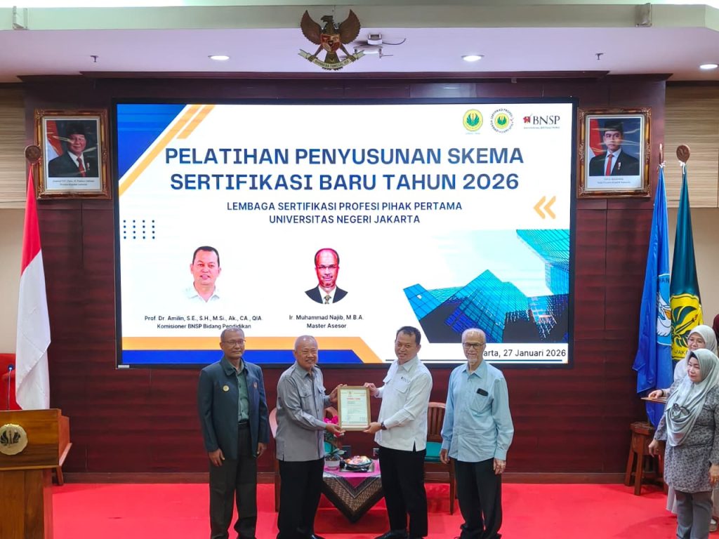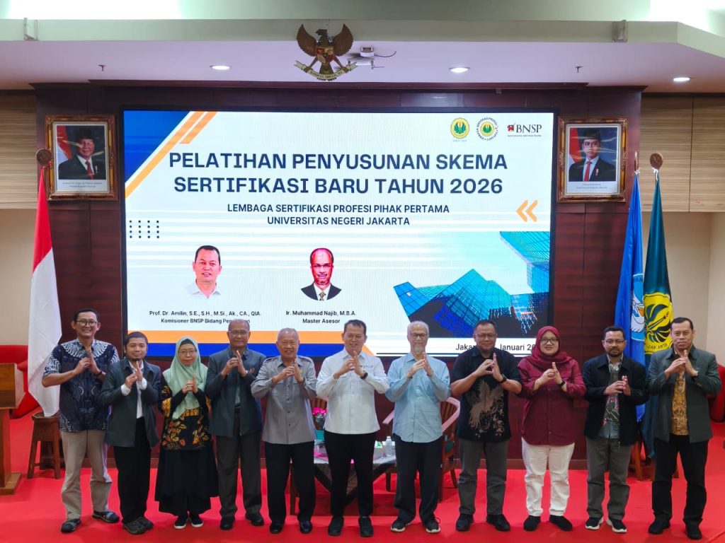 Jakarta, Humas UNJ – Lembaga Sertifikasi Profesi Pihak 1 Universitas Negeri Jakarta (LSP P1 UNJ) menyelenggarakan kegiatan Pelatihan Penyusunan Skema Sertifikasi Baru Tahun 2026. Acara ini berlangsung pada Selasa, 27 Januari 2026, bertempat di Aula Maftuchah Yusuf, Gedung Raden Dewi Sartika Lantai 2, Kampus A UNJ.