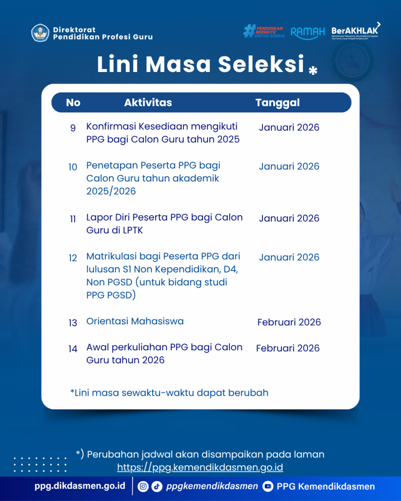 Informasi selengkapnya dan ketentuan lainnya silakan berkunjung ke laman resmi: https://ppg.kemdikdasmen.go.id