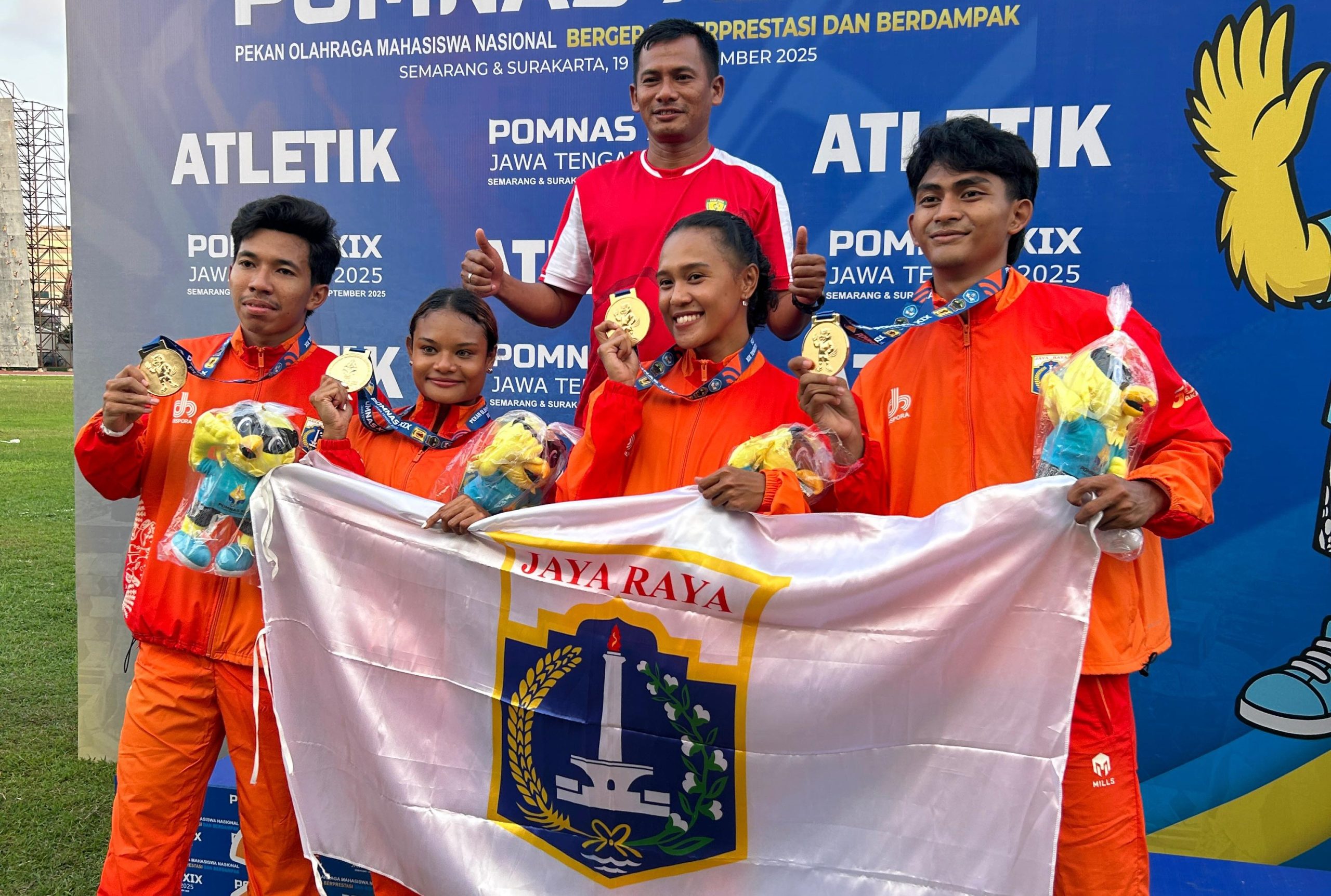 Semarang, Humas UNJ – Universitas Negeri Jakarta (UNJ) kembali menorehkan prestasi gemilang di ajang Pekan Olahraga Mahasiswa Nasional (POMNAS) XIX Tahun 2025. Dua mahasiswa UNJ, yakni Kezia Aghata Chalik dan Lalu Muhamad Septian Kusuma, berhasil meraih Medali Emas pada cabang olahraga (cabor) Atletik nomor Estafet 4×100 Meter Mix. Pertandingan ini berlangsung di Stadion Atletik Tri Lomba Juang, Mugassari, Semarang, pada Senin, 22 September 2025.