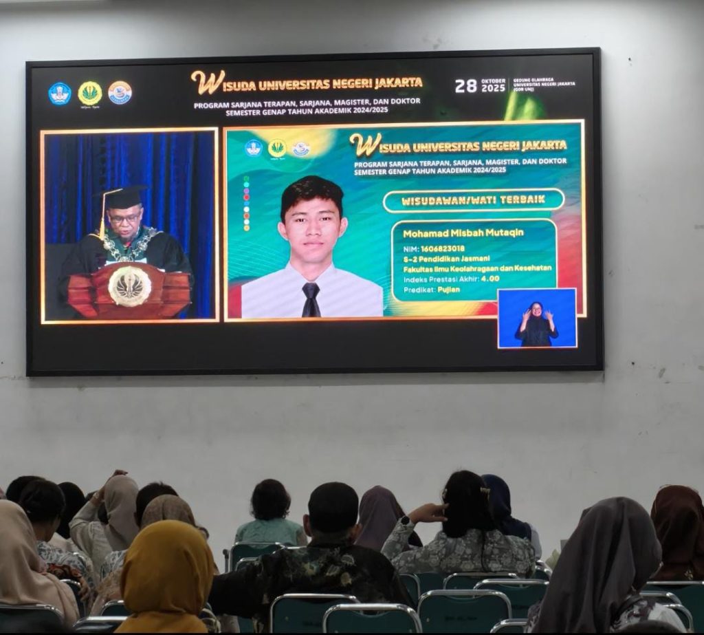 Jakarta, Humas UNJ — Mohamad Misbah Mutaqin, wisudawan Program Magister Pendidikan Jasmani Fakultas Ilmu Keolahragaan dan Kesehatan Universitas Negeri Jakarta (FIKK UNJ), berhasil meraih Indeks Prestasi Kumulatif (IPK) sempurna, yaitu 4.00. Ia juga dinobatkan sebagai wisudawan terbaik pada gelaran Wisuda Semester Genap Tahun Akademik 2024/2025 Gelombang Kedua di Sesi Kedua, yang diselenggarakan di Gedung Olahraga UNJ pada Kamis, 28 Oktober 2025.
