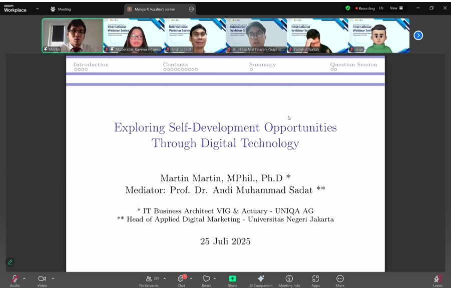 Jakarta, 26 Juni 2025 — Program Studi Pemasaran Digital, Fakultas Ekonomi dan Bisnis, Universitas Negeri Jakarta (FEB UNJ) sukses menggelar International Webinar Series 2025 pada Rabu, 25 Juni 2025. Webinar bertema “Exploring Self-Development Opportunities Through Digital Technology” ini menghadirkan Martin Martin, alumni Cambridge University yang kini menjabat sebagai Senior Actuarial Analyst dan Data Scientist di UNIQA Versicherung AG, perusahaan asuransi terkemuka yang berbasis di Viena, Austria.
