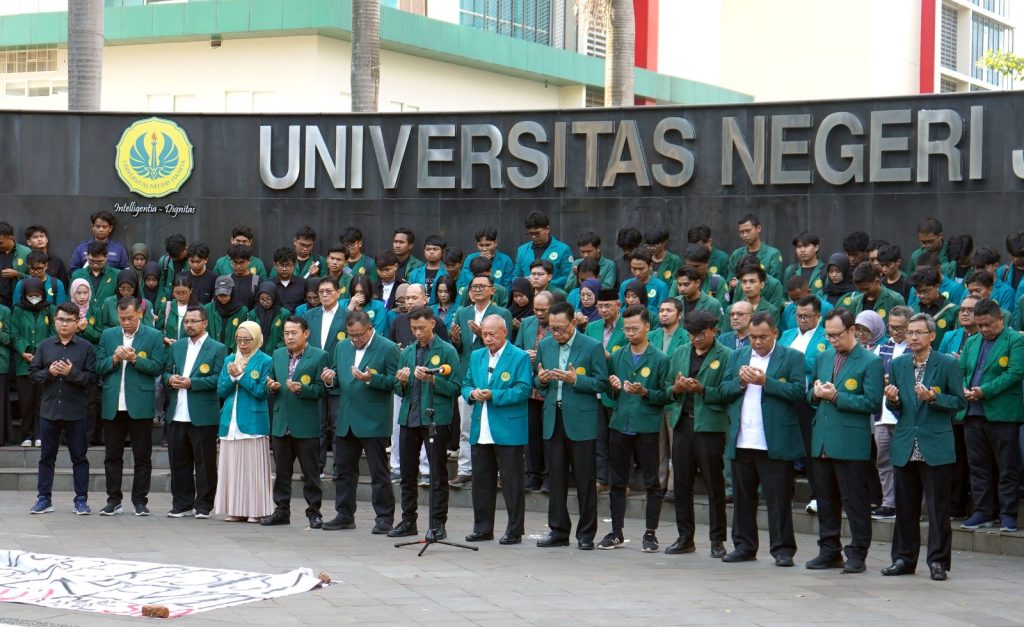 Jakarta, Humas UNJ – Sivitas Universitas Negeri Jakarta (UNJ) yang terdiri dari pimpinan, perwakilan Senat Akademik Universitas (SAU), Guru Besar, dosen, tenaga kependidikan, dan mahasiswa menggelar “Seruan Moral Rawamangun” pada Senin, 1 September 2025, di Plaza UNJ. Kegiatan ini menjadi wujud kepedulian moral UNJ terhadap kondisi kebangsaan yang akhir-akhir ini diwarnai ketegangan politik, jatuhnya korban jiwa, kerugian sosial, hingga kerusakan fasilitas umum. Dalam kesempatan tersebut, sivitas UNJ juga melakukan tabur bunga di hadapan foto almarhum Affan Kurniawan dan almarhum Reza Sendy Pratama sebagai simbol penghormatan sekaligus doa bersama untuk para korban.