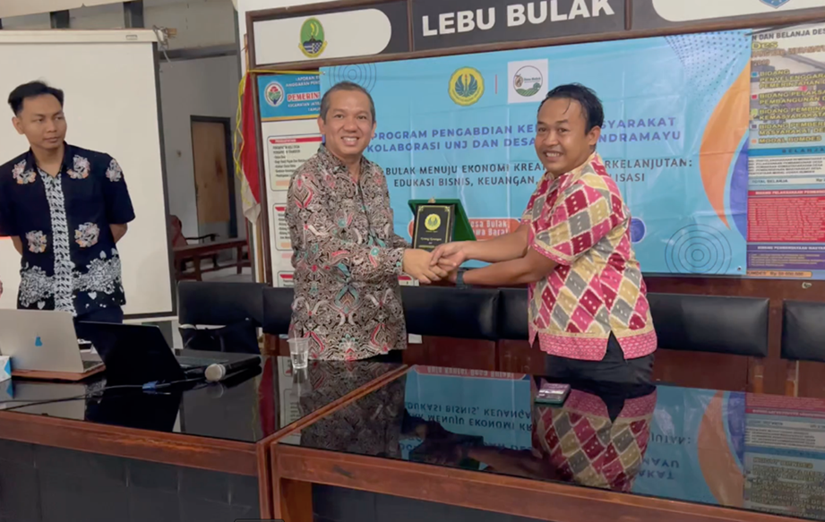 Indramayu, Humas UNJ — Dalam upaya mendorong kemandirian ekonomi desa berbasis kreativitas dan teknologi, Satuan Pengawasan Internal (SPI) dan Fakultas Ekonomi dan Bisnis (FEB) Universitas Negeri Jakarta (UNJ) menggelar kegiatan Pengabdian kepada Masyarakat (PkM) di Desa Bulak, Kabupaten Indramayu, Jawa Barat pada 11 Juni 2025. Mengusung tema “Desa Bulak Menuju Ekonomi Kreatif dan Berkelanjutan: Edukasi Bisnis, Keuangan dan Digitalisasi,” kegiatan ini dilaksanakan di Aula Desa Bulak dan dihadiri oleh puluhan pelaku usaha mikro, perangkat desa, serta tokoh masyarakat setempat.