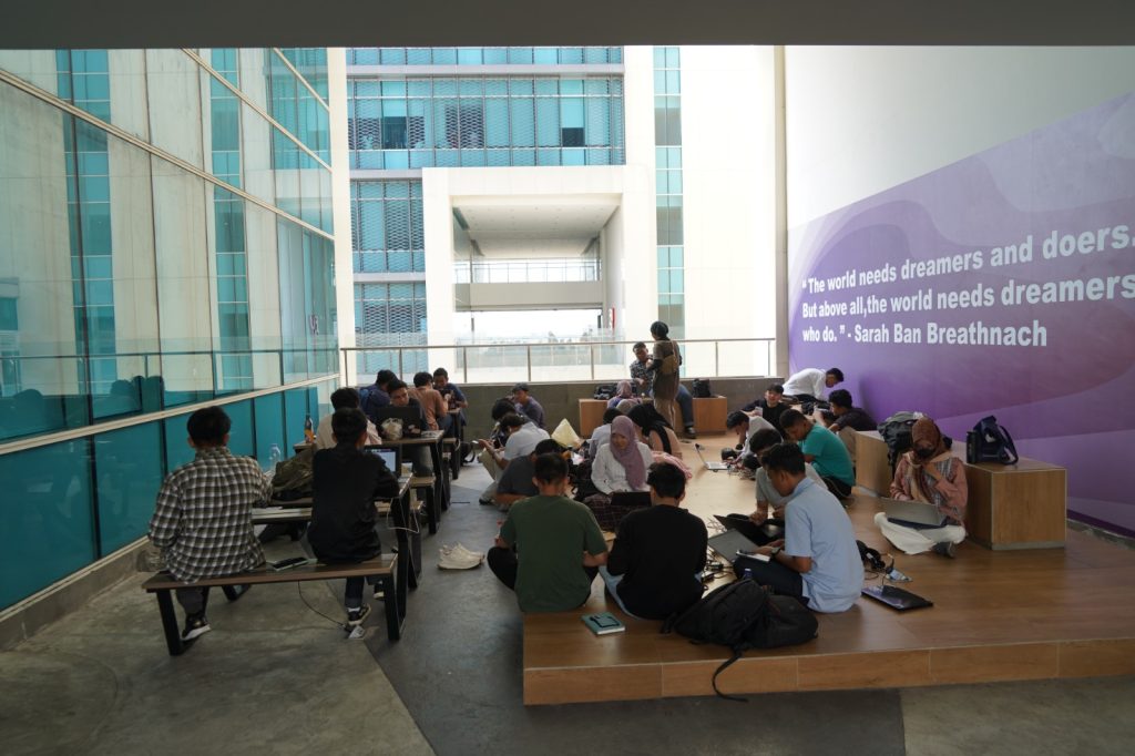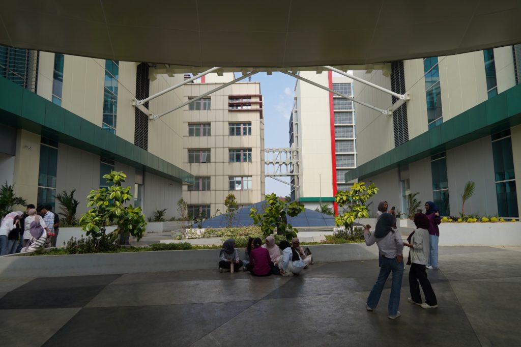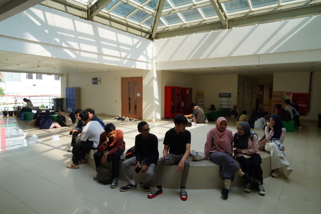 Selain lantai 6, area terbuka di lantai 2 yang terletak di antara Gedung 1A dan 1B juga menjadi tempat favorit mahasiswa. Area ini dilengkapi taman dan ruang duduk bersama yang cocok untuk bersantai sambil menunggu jadwal kuliah.