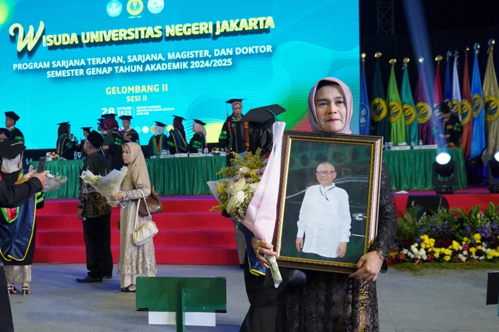 Jakarta, Humas UNJ — Tidak ada yang pernah benar-benar siap melepas seseorang yang dicintai, terutama ketika mimpi besar yang diperjuangkannya tinggal selangkah lagi untuk diwujudkan. Hari itu, Selasa, 28 Oktober 2025, Gedung Olahraga Universitas Negeri Jakarta (GOR UNJ) menjadi saksi bisu sebuah kisah tentang cinta, keteguhan, dan pengabdian seorang ayah kepada ilmu. Prosesi Wisuda Semester Genap Tahun Akademik 2024/2025 Gelombang Kedua di Sesi Kedua berlangsung khidmat dan penuh kebanggaan, namun di tengah gegap gempita toga dan tepuk tangan, ada satu kursi yang menyimpan cerita paling menyentuh hari itu.