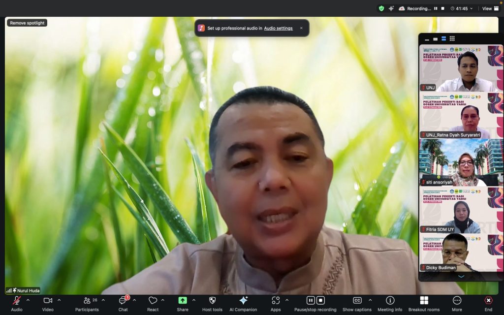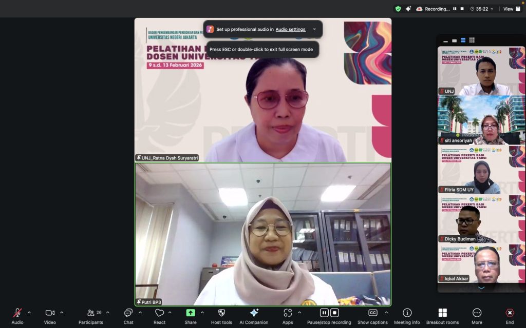 Jakarta, Humas UNJ – Universitas Negeri Jakarta secara resmi membuka kegiatan Pelatihan Pengembangan Keterampilan Dasar Teknik Instruksional (PEKERTI) bagi dosen Universitas YARSI (Yayasan Rumah Sakit Islam Indonesia) pada Senin 9 Februari 2026. Mengingat efisiensi dan fleksibilitas, seremoni pembukaan diselenggarakan secara daring melalui platform Zoom Meeting dengan dihadiri oleh 20 dosen perwakilan dari berbagai fakultas di Universitas YARSI. Kegiatan Pelatihan PEKERTI bagi Dosen Universitas YARSI ini dilaksanakan mulai tanggal 9 – 13 Februari 2026.