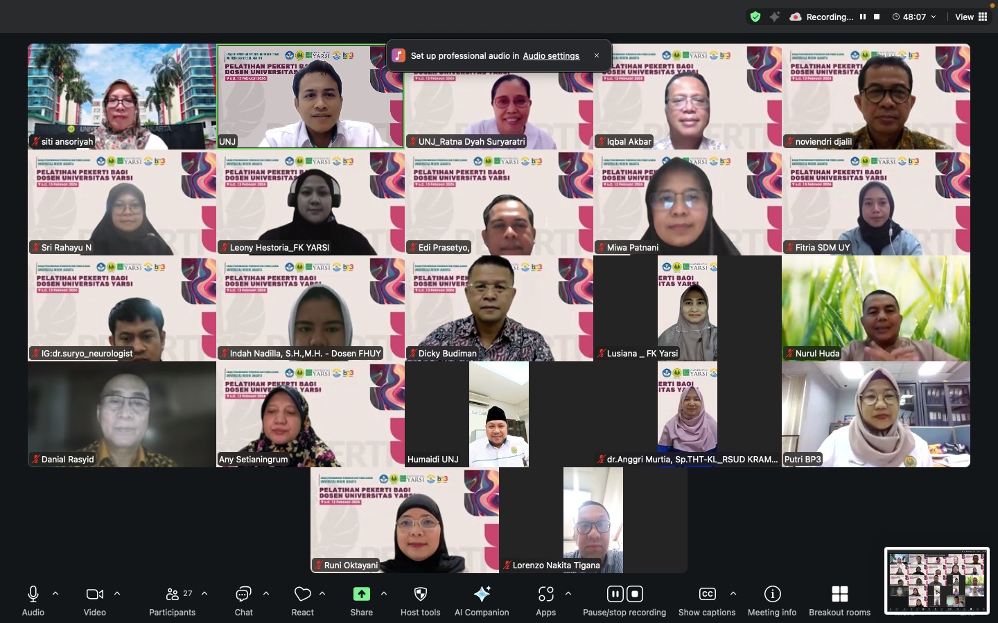 Jakarta, Humas UNJ – Universitas Negeri Jakarta secara resmi membuka kegiatan Pelatihan Pengembangan Keterampilan Dasar Teknik Instruksional (PEKERTI) bagi dosen Universitas YARSI (Yayasan Rumah Sakit Islam Indonesia) pada Senin 9 Februari 2026. Mengingat efisiensi dan fleksibilitas, seremoni pembukaan diselenggarakan secara daring melalui platform Zoom Meeting dengan dihadiri oleh 20 dosen perwakilan dari berbagai fakultas di Universitas YARSI. Kegiatan Pelatihan PEKERTI bagi Dosen Universitas YARSI ini dilaksanakan mulai tanggal 9 – 13 Februari 2026.