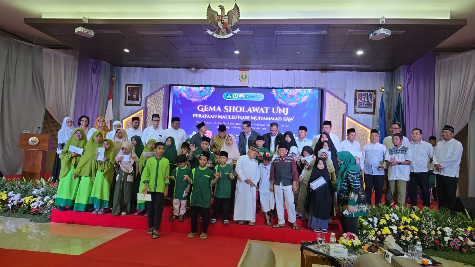 Jakarta, Humas UNJ — Lantunan sholawat menggema lembut memenuhi Aula Latief Hendraningrat Universitas Negeri Jakarta (UNJ) pada Selasa, 25 November 2025. Melalui kegiatan Gema Sholawat dalam rangka peringatan Maulid Nabi Muhammad SAW, UNJ menghadirkan ruang refleksi spiritual yang menautkan nilai cinta kasih Rasulullah dengan kehidupan sivitas akademika. Selain Gema Sholawat, pada kegiatan ini juga dilaksanakan santunan bagi anak yatim di Yayasan Asrama Rumah Harapan Kayu Putih dan Pondok Yatim Dhuafa Matraman, Jakarta Timur. Kehadiran anak-anak yatim yang duduk berdampingan dengan peserta menjadi pengingat kuat bahwa Maulid bukan sekadar peringatan sejarah, melainkan penegasan nilai kepedulian yang diwariskan Rasulullah SAW.