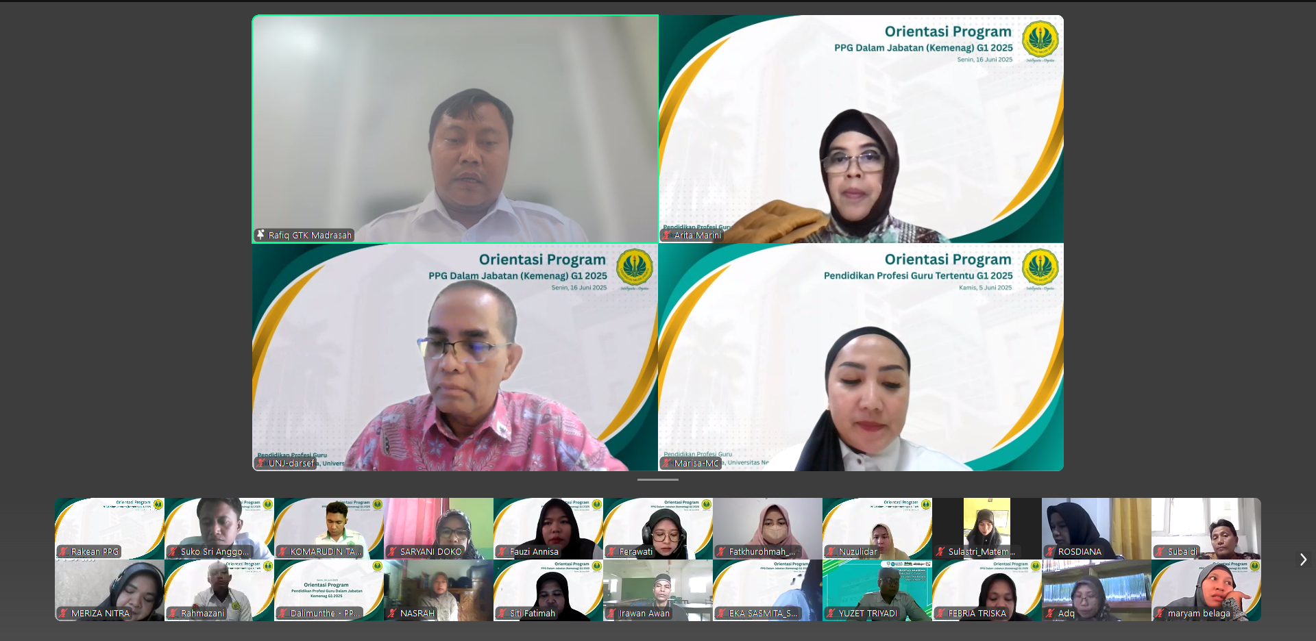 Jakarta, Humas UNJ – Sekolah Pascasarjana Universitas Negeri Jakarta (UNJ) menyelenggarakan kegiatan orientasi bagi mahasiswa baru Program Pendidikan Profesi Guru (PPG) dalam Jabatan Kementerian Agama (Kemenag) Batch 1 Tahun 2025. Kegiatan ini dilaksanakan secara daring melalui platform Zoom dan YouTube pada Senin, 16 Juni 2025.