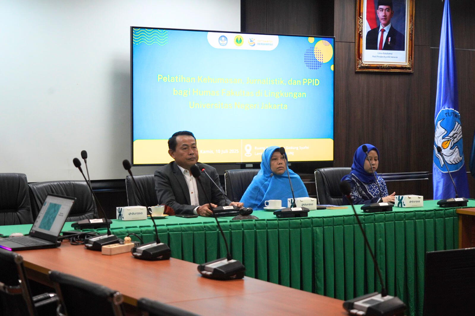 Jakarta, Humas UNJ — Dalam rangka meningkatkan kualitas kehumasan dan pelayanan publik, Universitas Negeri Jakarta (UNJ) melalui Kantor Humas dan Informasi Publik menyelenggarakan pelatihan bertema “Pelatihan Kehumasan, Jurnalistik, dan PPID bagi Humas di Lingkungan Universitas Negeri Jakarta” yang berlangsung di Lantai 8, Gedung Syafei, Kampus A UNJ. Kegiatan ini diselenggarakan pada Kamis, 10 Juli 2025.