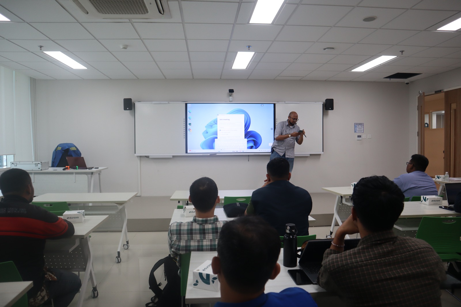 Pelatihan difokuskan pada pemanfaatan teknologi Smartboard dan AI-Powered Camera Conference sebagai sarana pendukung perkuliahan, baik secara daring maupun luring. Teknologi Smartboard memungkinkan penyampaian materi secara interaktif dan dinamis, sementara kamera konferensi berbasis kecerdasan buatan mampu menyesuaikan fokus secara otomatis, meningkatkan kualitas audio-visual, serta memperkuat keterlibatan antara dosen dan mahasiswa.