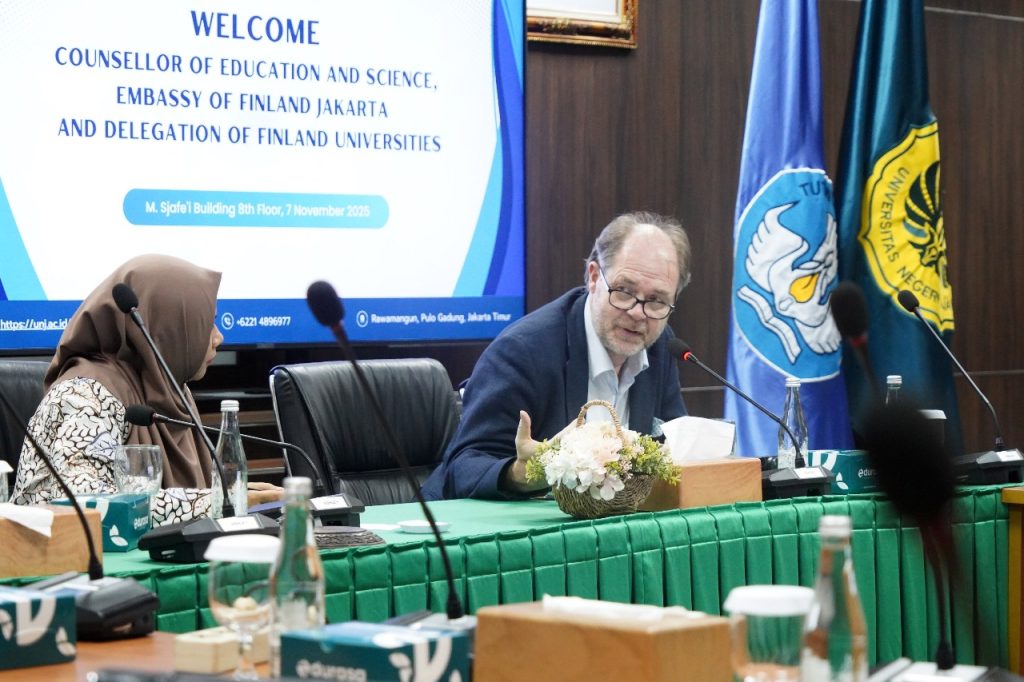 Sambutan positif disampaikan oleh Mr. Mika Tirronen, yang mengapresiasi sambutan hangat dari UNJ dan menegaskan komitmen Finlandia dalam memperkuat hubungan pendidikan dengan Indonesia.