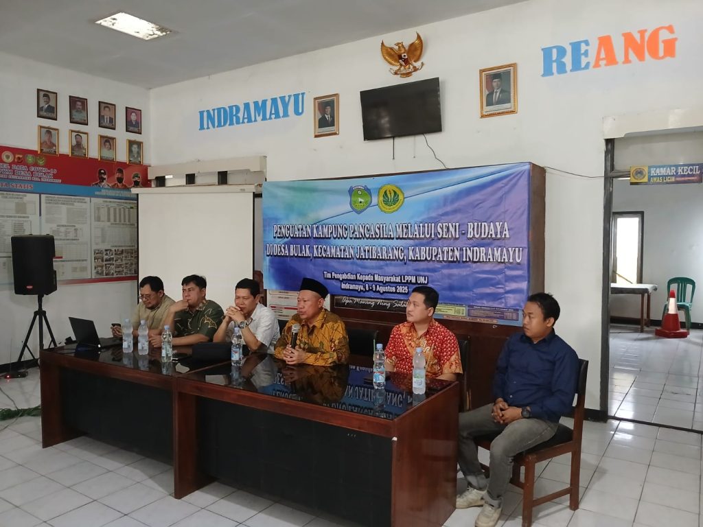 Indramayu, Humas UNJ –Universitas Negeri Jakarta (UNJ) kembali menunjukkan komitmennya dalam memajukan masyarakat melalui program Pengabdian kepada Masyarakat Penugasan Institusional (P2M PI). Kali ini, tim yang diketuai oleh Prof. Komarudin, dengan anggota Agus Wibowo, dan Ahmad Tarmiji Alkhudri, hadir di Aula Desa Bulak, Kecamatan Jatibarang, Kabupaten Indramayu, untuk menggelar kegiatan bertajuk “ Penguatan Kampung Pancasila Melalui Seni-Budaya “. Kegiatan ini dilaksanakan dari 8 – 9 Agustus 2025.
