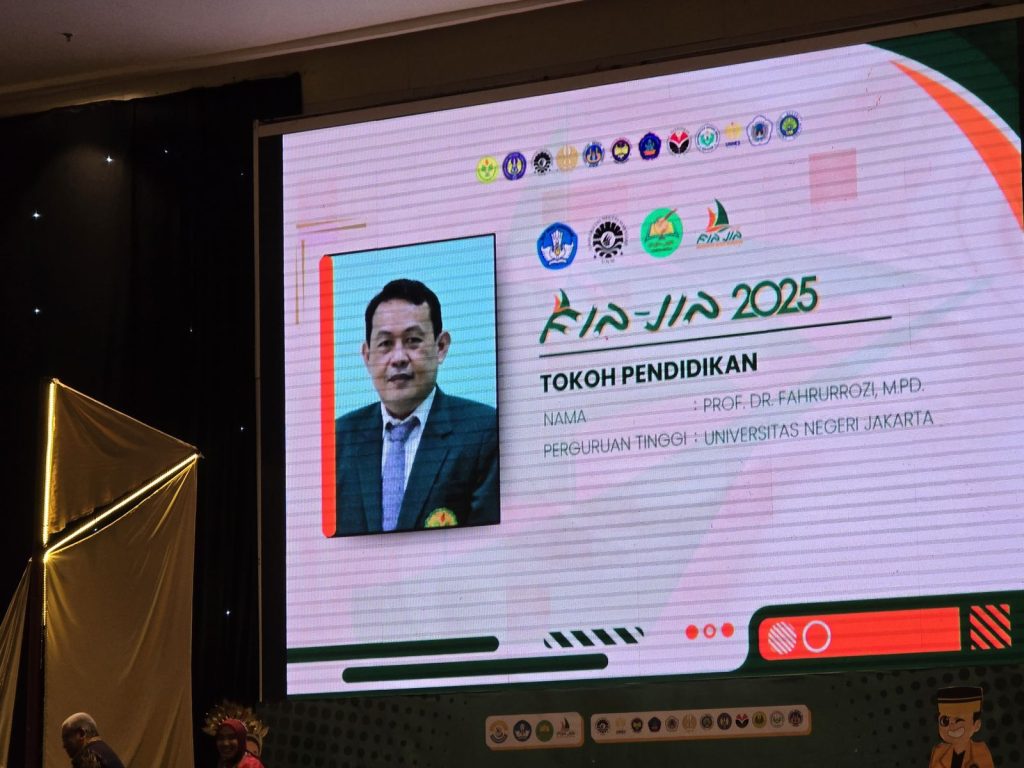 Makassar, Humas UNJ — Forum Fakultas Ilmu Pendidikan-Jurusan Ilmu Pendidikan (FIP-JIP) secara resmi menganugerahkan gelar Tokoh Pendidikan kepada perwakilan 12 Lembaga Pendidikan Tenaga Kependidikan (LPTK) yang tergabung dalam keanggotaan Asosiasi FIP-JIP. Salah satu penerima penghargaan tersebut, yaitu Prof. Fahrurrozi, guru besar Fakultas Ilmu Pendidikan Universitas Negeri Jakarta (FIP UNJ) yang juga Wakil Rektor Bidang Riset, Inovasi, dan Sistem Informasi UNJ atau Wakil Rektor Bidang 3 UNJ. Penghargaan ini diberikan dalam acara puncak Forum FIP-JIP yang digelar pada Rabu, 25 Juni 2025, di Hotel Claro, Makassar. Pada tahun ini panitia Forum FIP-JIP diselenggarakan oleh Fakultas Ilmu Pendidikan Universitas Negeri Makassar (FIP UNM).